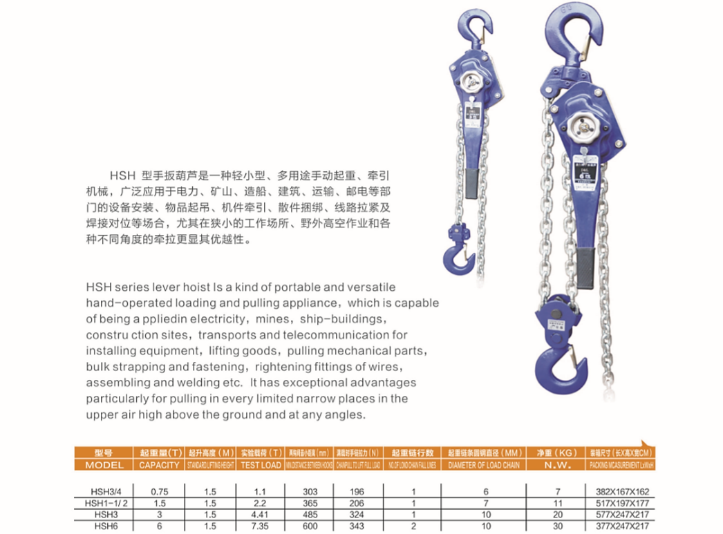 HSH series lever hoist is a kind of portable and versatile hand-operated loading and pulling appliance,which is capable of electric,mines,ship -buildings,construction sites,transports and telecommunications for installing equipment,lifting goods,pulling mechanical parts,bulk strapping and fastening,rightening fittings of wires,assembling and welding etc.It has exceptional advantages particular for pulling in every limited narrow places in the upper air electric,mines,ship-buildings. high above the ground and at any angle.