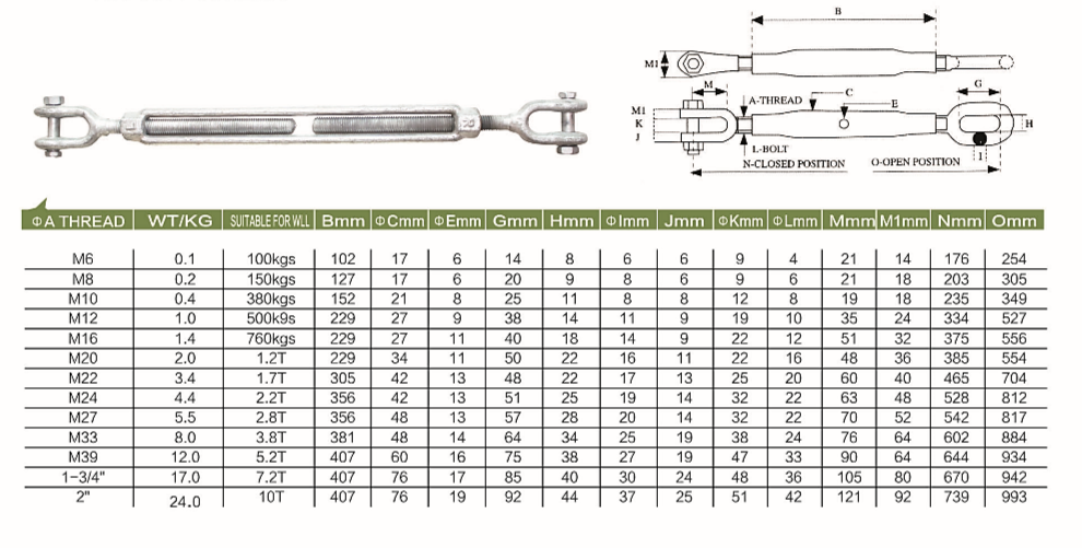 Jaws are forged with a greater cross sectional area that results in a stronger jaw with better fatigue properties.Turnbuckles recommended for straight or in-line pulls only.